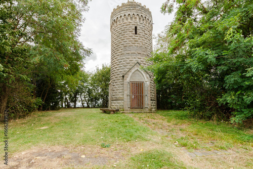 © Heidi, Naklejka premium Der historische Bismarckturm steht inmitten von Bäumen und Grünflächen. Seine markante Steinarchitektur mit Tor und Zinnen hebt sich klar vom umgebenden Naturraum ab.
