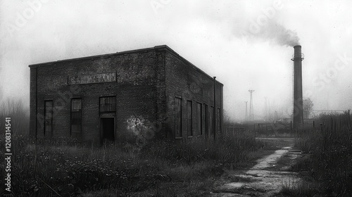 © Maksday, Obraz premium Derelict brick building and smokestack in foggy landscape.