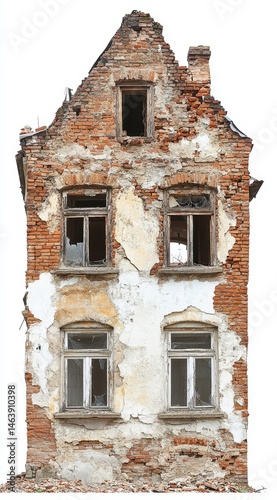 © Yothin, Fototapeta premium Derelict Brick Building Facade with Broken Windows