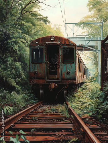 © ivlianna, Obraz premium Derelict train car overgrown with vegetation on rusted tracks in a secluded forest setting