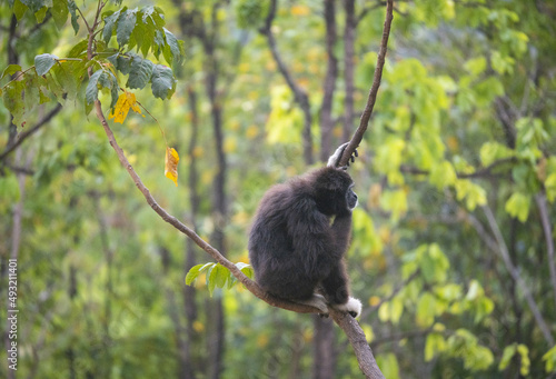 Naklejka premium Des grands singes, des gibbons à mains blanches évoluant dans les arbres avec...