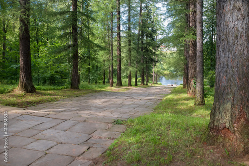 © Konstantin, Obraz premium Descent to the pond along the forest alley