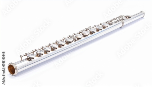 Fototapeta premium Describe a silver flute with cylindrical body, metal keys, and mouthpiece, placed against a white background. Highlight its sleek design and relevance to classical music and woodwind instruments.