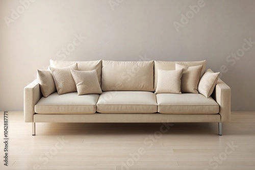 Fototapeta premium Description: Beige couch with white cushion on beige background viewed from...