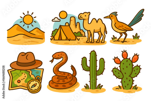 © Karla, Obraz premium Desert adventure icon set. Vector cartoon collection for travel and exploration. Wildlife and nature concepts. Features camel, snake, roadrunner, saguaro cactus, map, compass.