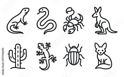 © Soliannikov Yevhenii, Naklejka premium Desert animal icons: lizard, snake, scorpion, kangaroo, cactus, gecko, beetle, fennec