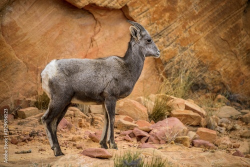 Naklejka premium Desert bighorn sheep (Ovis canadensis nelsoni), young animal standing in front of red sandstone rocks, Rainbow Vista, Valley of Fire State Park, Nevada, USA, North America