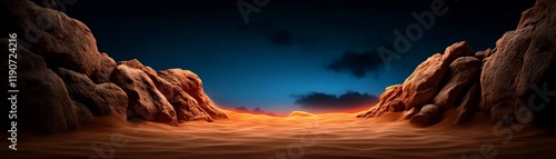 Naklejka premium Desert Canyon at Dusk: A dramatic, cinematic view of a desert canyon at dusk, with towering sandstone cliffs framing a glowing orange and blue sky. The scene evokes a sense of mystery and adventure.