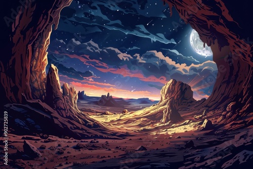 © boler, Fototapeta premium Desert Canyon Landscape with Moon and Stars
