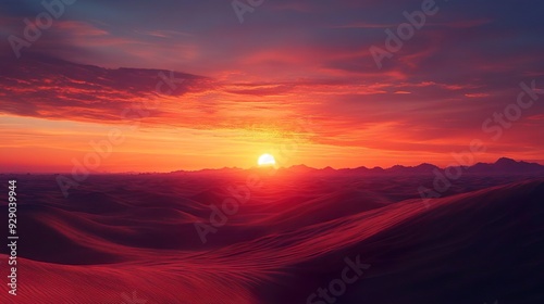© saikat, Fototapeta premium Desert Dawn Glory Fiery Sky and Serene Sand Dunes at Sunrise