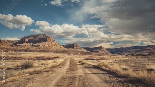 Naklejka premium Desert dirt road to the mountains. A long dirt road heads towards the mountains on a partly cloudy day