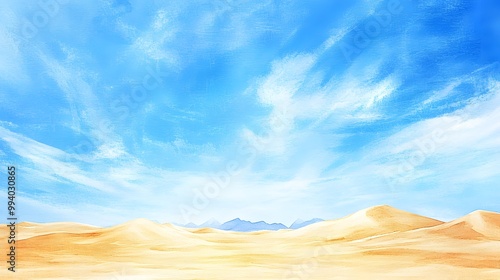 © Mingpon, Fototapeta premium Desert dunes under a bright blue sky, watercolor strokes emphasizing the vastness