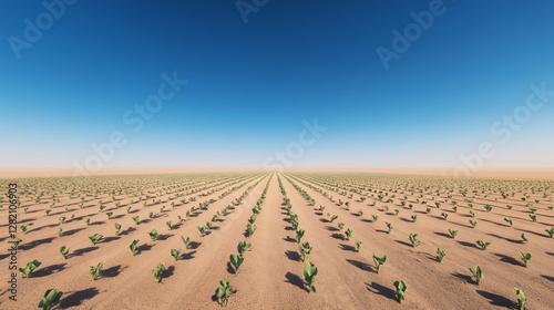 © creativeideh, Naklejka premium Desert farming seedlings planted in arid landscape