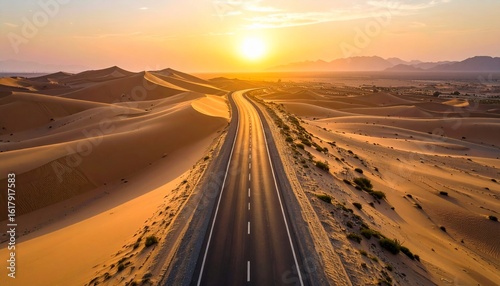 © ardi, Fototapeta premium Desert Highway Sunset: An Aerial View of a Scenic Road Cutting Through Golden Sands at Dusk