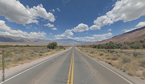 Naklejka premium Desert Highway Under Blue Sky with Mountains in Background