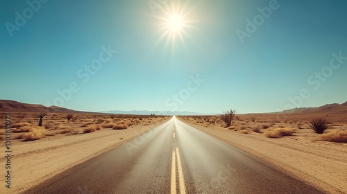 Naklejka premium Desert Highway Under the Blazing Sun: A Road Trip through the Arid Landscape