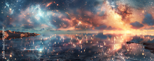 Fototapeta premium Desert lagoon at night, with the Milky Way stretching across the sky and the water mirroring the stars