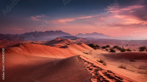 Naklejka premium Desert landscape at dawn with reddish sand dunes and mountains.