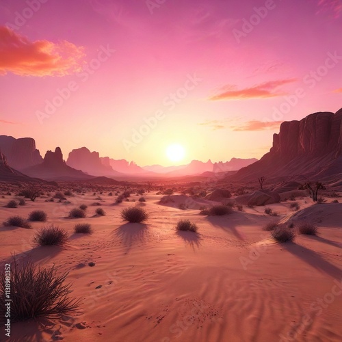Naklejka premium Desert landscape at dusk with a vibrant orange and pink sunset, rocky hills,...