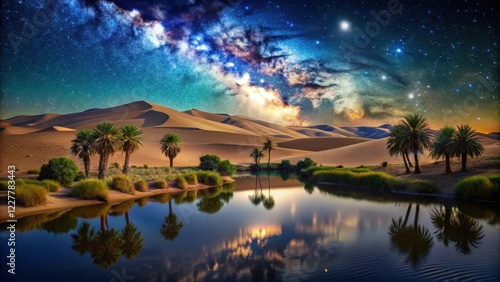 © Praphunsak, Obraz premium Desert landscape at night with towering dunes under starry sky