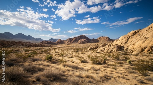 Fototapeta premium Desert landscape, rocky mountains, blue sky, sparse vegetation.
