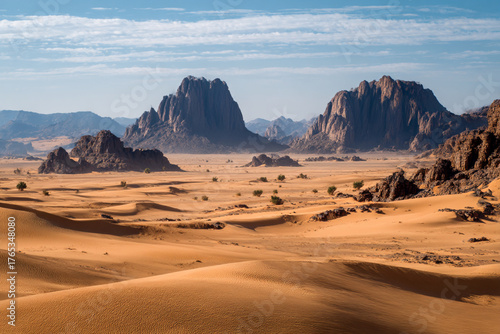 © boulham, Naklejka premium Desert landscape, sand dunes and rocky mountains sunset. Dramatic view sahara. Red Mars like landscape. beautiful rock formations. Orange red sand desert, rocky formations and mountains background.