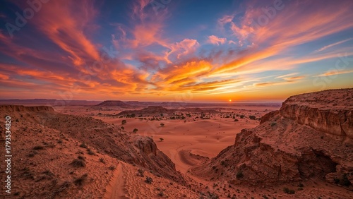 Fototapeta premium Desert landscape with cliffs at sunset showcasing vibrant sky and dramatic...