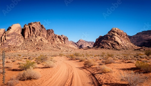© Alanna, Fototapeta premium desert landscape with dusty trail and rocky mountains under clear blue sky