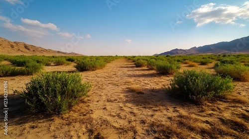 Fototapeta premium Desert Landscape with Green Bushes and Sandy Path