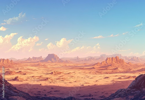 Fototapeta premium Desert landscape with mountains in the background. The sky is blue and the...
