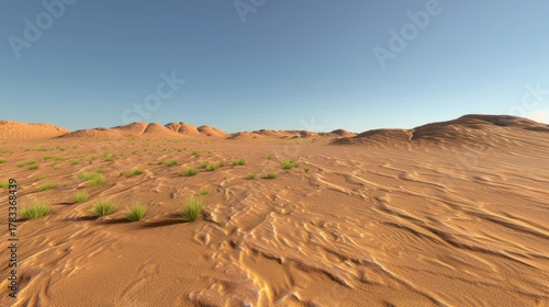 Naklejka premium Desert Landscape with Sand Dunes and Sparse Green Vegetation Under Clear Blue...