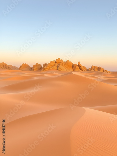 Naklejka premium Desert landscape with sandy dunes and beige rocky outcrops at dusk, golden,...