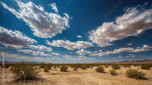 Fototapeta premium Desert Landscape with Scattered Bushes and a Blue Sky with White Clouds