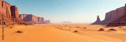 Naklejka premium Desert landscape with vast sand dunes and rock formations, vast space, arid land, emptiness