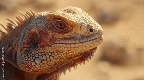 Fototapeta premium Desert lizard portrait, sunlit sand background, wildlife