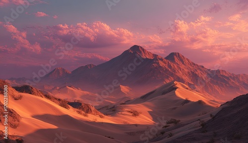 © aandd, Fototapeta premium Desert mountains at sunset. Pink clouds