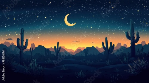 Naklejka premium Desert Night Sky with Crescent Moon and Cactus Silhouettes - Starry Night Landscape Illustration