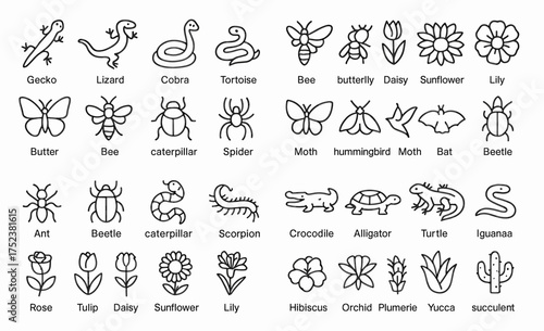 © Nataliia, Fototapeta premium Desert outline icons collection: animals, insects, flowers