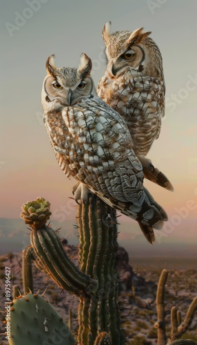 Obraz premium Desert Owls Perched on Cactus at Sunset - Wildlife Photography for Nature,...