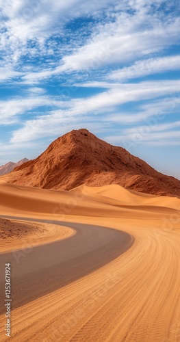 © adspttra, Naklejka premium Desert road curves past red dune, blue sky. Travel background