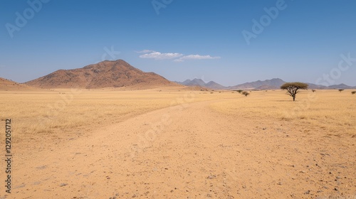 © KIMEHIME, Fototapeta premium Desert road leading to mountains, clear sky. Travel brochure