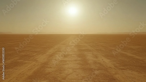 Naklejka premium Desert Road to the horizon: Witness the stark beauty of a vast, open desert landscape with a road stretching towards the horizon under a bright sun, evoking a sense of solitude and adventure.