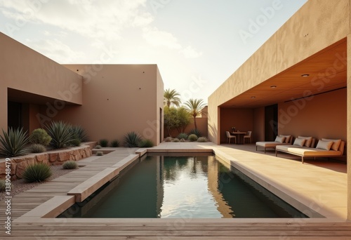 © Eliane, Obraz premium "Desert Sanctuary: Explore a Minimalist Adobe Home with Monolithic Forms, Reflective Pool, and Lush Desert Landscaping, Seamlessly Blending Contemporary Luxury with Earthy Tranquility"