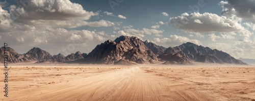 © fadillah, Fototapeta premium Desert scene with a winding road leading toward mountains under a cloudy, dramatic sky