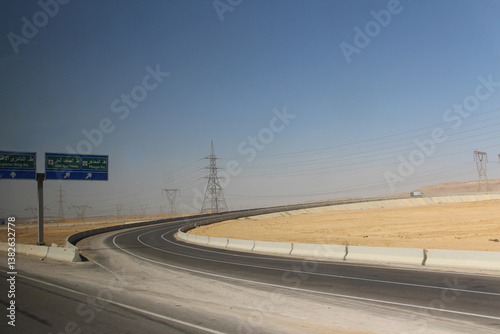 © Crystaltmc, Fototapeta premium Desert scenery with the transmission tower on the road trip from Hurghada to Cairo, Egypt