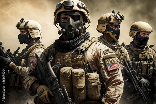 Fototapeta premium Desert Special Forces Military Unit in Full Tactical Gear in the desert, generative ai