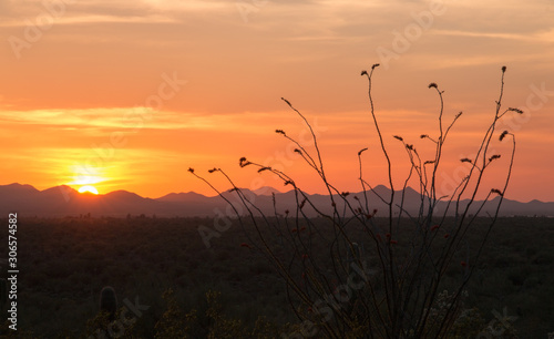 © Dawn, Obraz premium Desert sunset in Tucson with mountains in background and cacti silhouettes in foreground