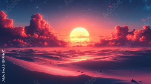 Fototapeta premium Desert sunset, red clouds, starry sky, landscape, fantasy art