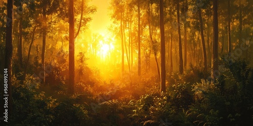 © kwanchaift, Fototapeta premium Desert sunsets blend with the forest, where the warm, golden light filters through the dense trees