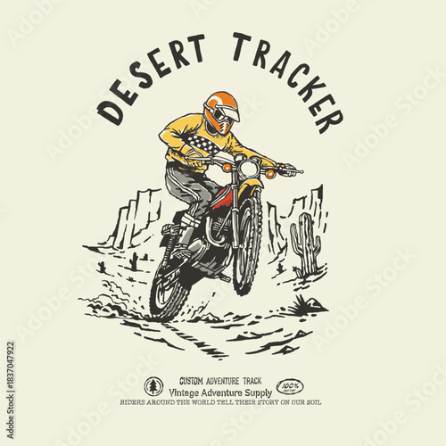 © Nasiruddin, Obraz premium Desert Tracker vintage custom trail bike custom motorcycle illustration desert landscape nature national park. Retro outdoor apparel design